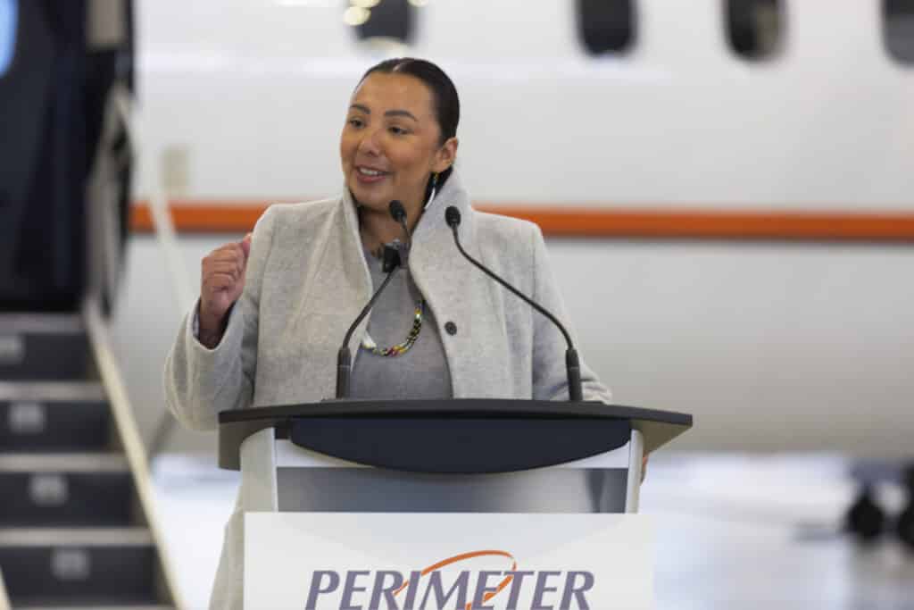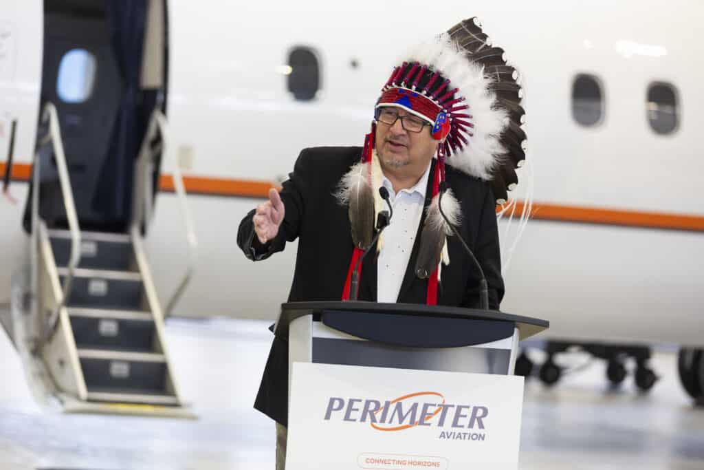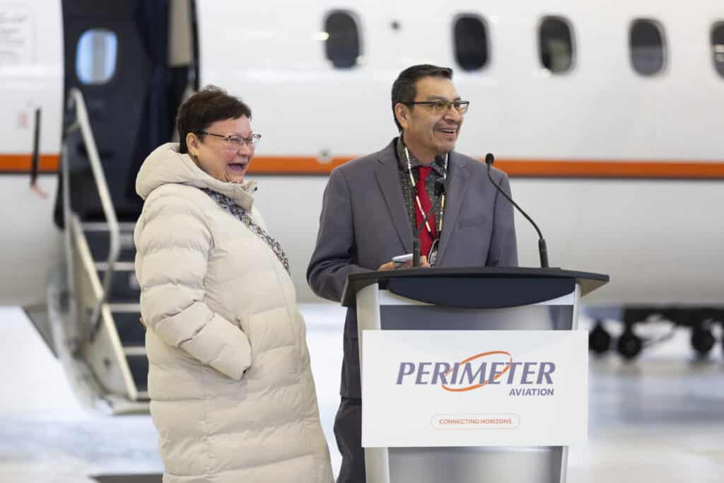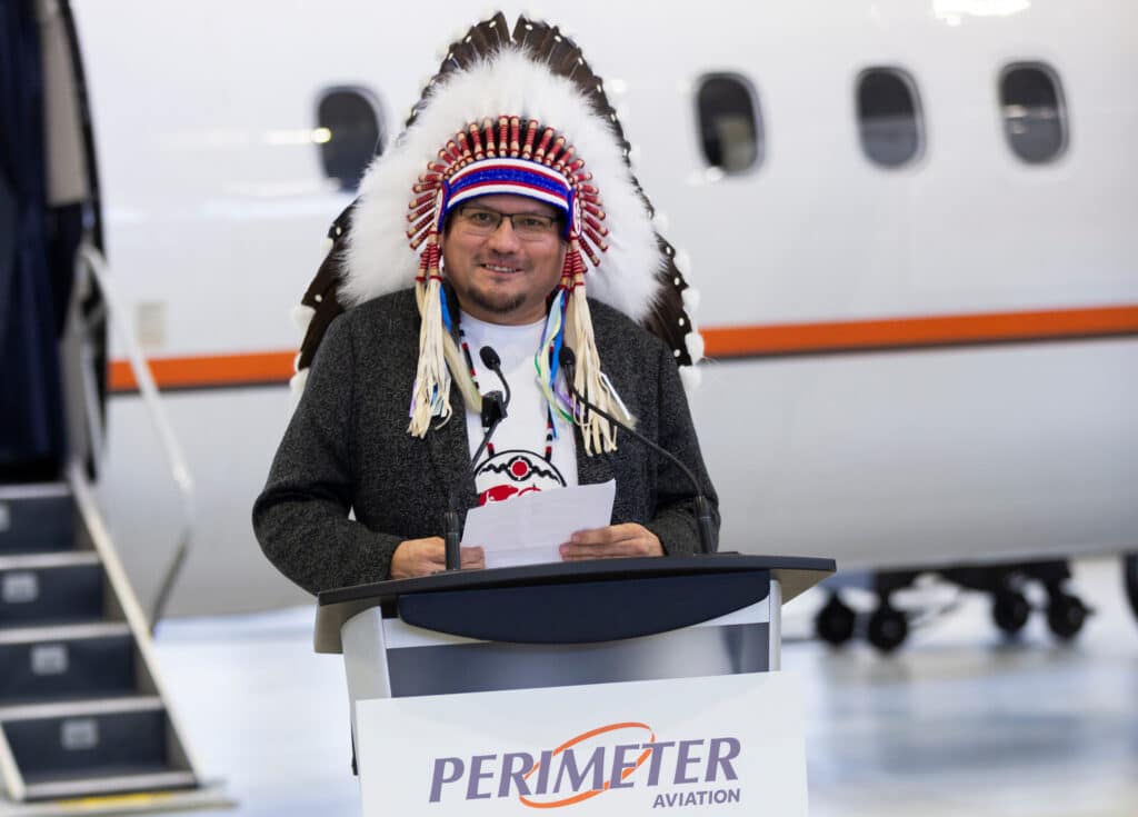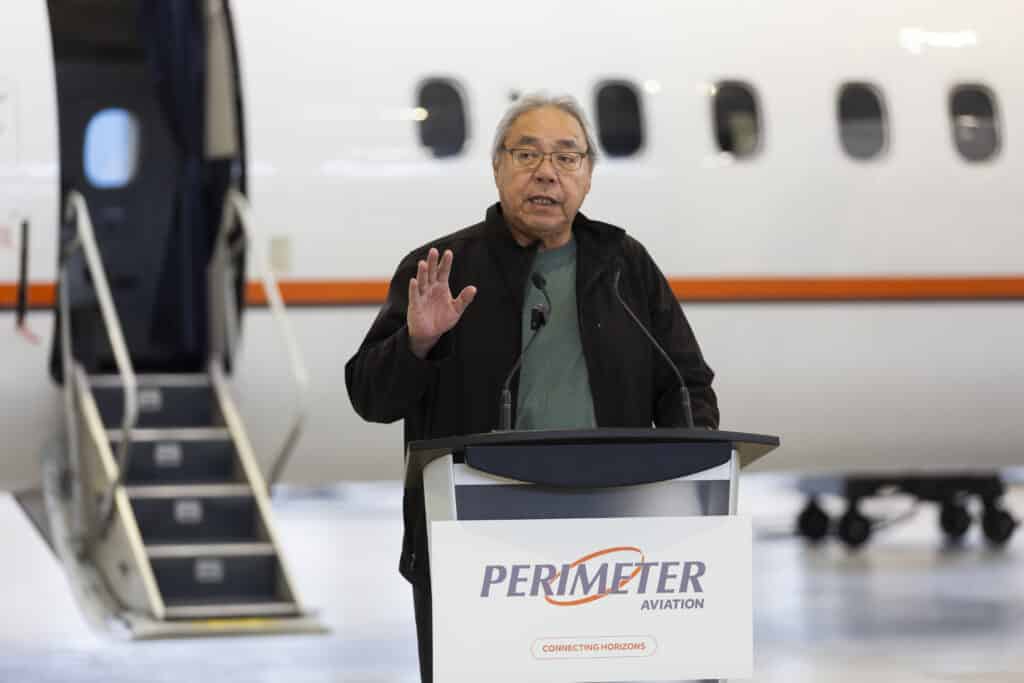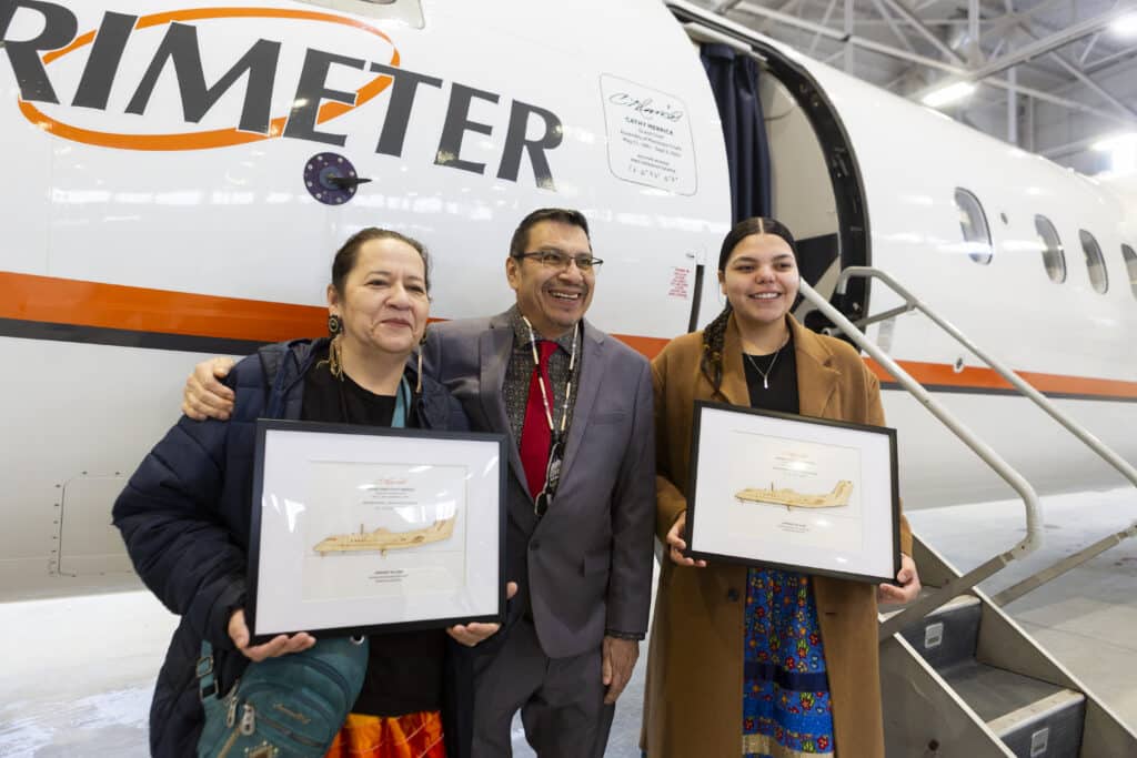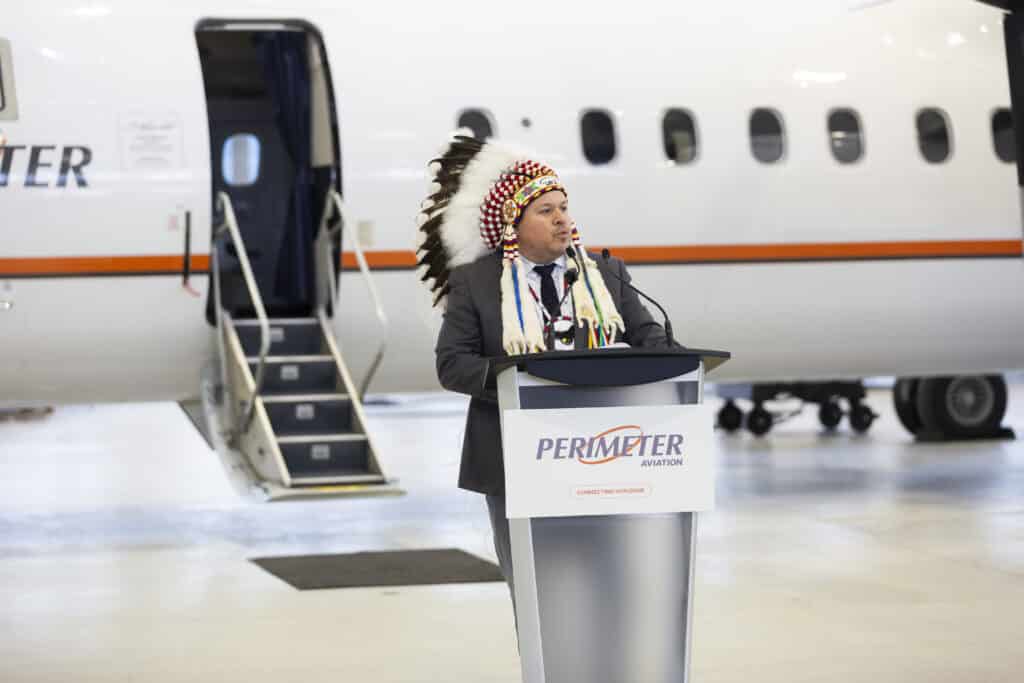 On January 28, a dedication event was held, gathering leaders, family members, stakeholders, and Perimeter Aviation employees to commemorate the dedication of C-GYCM. The event began with a traditional pipe ceremony and blessing of the aircraft and hangar, led by Elder David Blacksmith. His presence and guidance set a meaningful tone for the day.